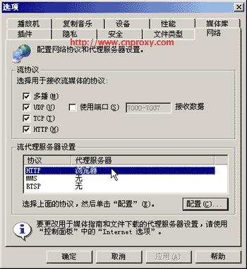 以RealOne Player 2.0為例。單擊菜單“工具→首選項→連接”,進入“代理服務器” 標簽頁,如圖所示。