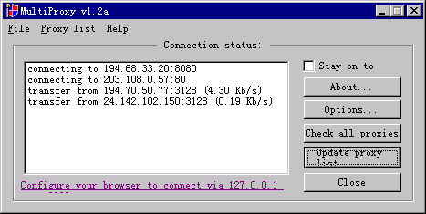 圖1顯示了MultiProxy實(shí)際使用的界面,可看出它連接了多個站點(diǎn),并從多個代理地址傳送數(shù)據(jù)。