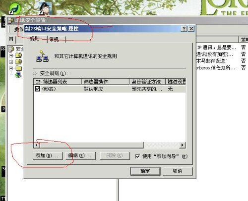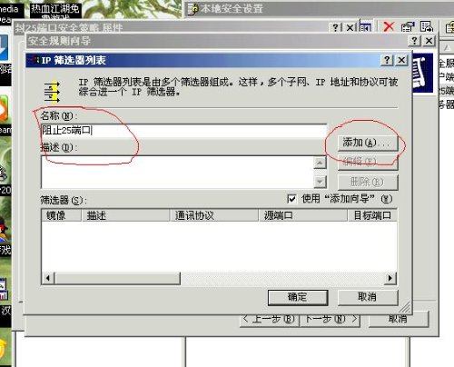 下一步---IP篩選器列表中按添加(添加之前名稱自己取.或為默認(rèn)名).朋友取名為阻止25端口