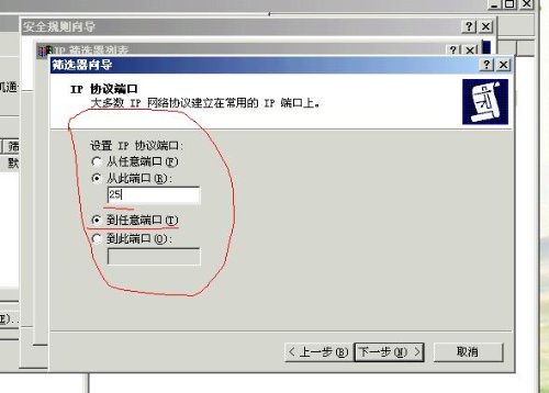 新出現(xiàn)的窗口中.按照框框提示選擇.再按添加---下一步---源地址填(我的IP地址)---下一步.目標(biāo)地址填(任何IP地址)---點下一步.選擇協(xié)議類型填(TCP)---端口設(shè)置中選擇(從此端口填25,到任意端口 )---確定!