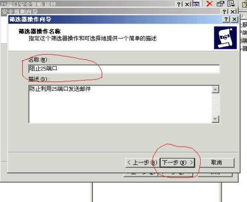 下一步---輸入策略名稱,你可以取名稱為   (封25端口)