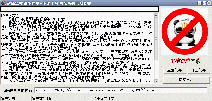 此為犯罪嫌疑人李俊在看守所里編寫的“熊貓燒香”殺毒軟件程序.經試驗.該程序能在幾分鐘內徹底殺滅“熊貓燒香”病毒。