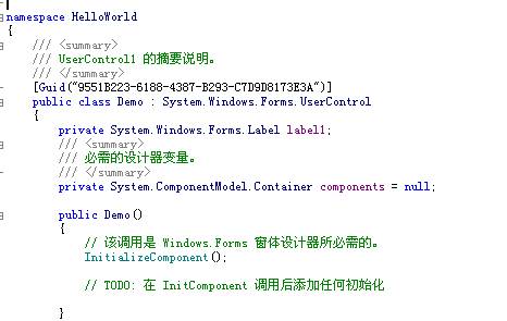 首先使用 工具—〉創(chuàng)建GUID 生成一個(gè)GUID,并修改UserControl1.cs文件。首先增加引用System.Runtime.InteropServices命名空間,并在Demo前面加入一條語句: