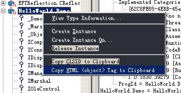 可以看到,我們寫的HelloWorld.Demo已經(jīng)被正確識(shí)別為COM組件?,F(xiàn)在,我們已經(jīng)可以像使用其它ActiveX控件一樣在網(wǎng)頁中顯示了。在HelloWorld.Demo點(diǎn)擊鼠標(biāo)右鍵,如圖: