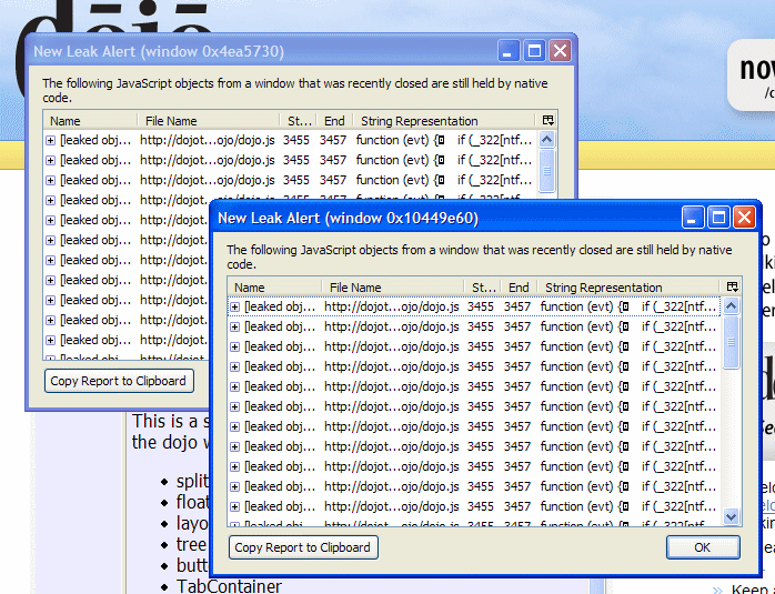 這是個(gè)方便的FireFox擴(kuò)展,當(dāng)你離開那頁的時(shí)候它便會(huì)指向JavsScript對象,如果出現(xiàn)泄漏的話會(huì)彈出一個(gè)窗口顯示細(xì)節(jié)內(nèi)容,而且能夠告訴你是那個(gè)對象或函數(shù)引起的泄漏。
