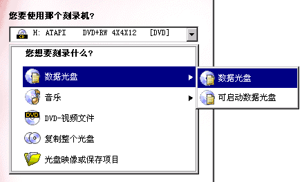 顯示出刻錄盤的總?cè)萘亢褪欠褚呀?jīng)刻錄的信息。關(guān)掉這個(gè)窗口,我們在主窗口選擇刻錄數(shù)據(jù)光盤,繼續(xù)。