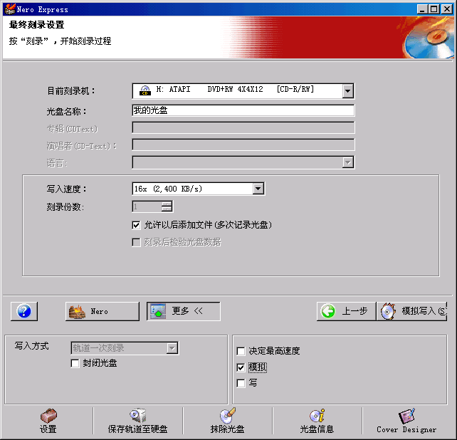 同樣,我們選用CD刻錄功能也刻了一張盤,可以用16X寫入(每秒2.4M):