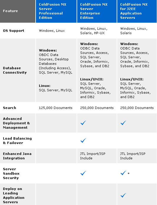 在講解ColdFusion MX的基礎管理操作以及入門程序之前,先來了解一下ColdFusion MX各種版本之間的差別。ColdFusion MX目前分為商用版本和開發(fā)者版本兩部分,而商用版本又包括專業(yè)版和企業(yè)版兩種。顧名思義,開發(fā)者版本是提供給開發(fā)者個人使用的版本,該版本在功能上做了一些限制。比如使用開發(fā)者版本的ColdFusion MX Server在同時訪問的ip上做了限制,還有就是沒有Macromedia Cluster的支持(web均衡負載),另外還有一些企業(yè)版的功能,開發(fā)者版本和專業(yè)版本都不具備。此外,ColdfusionMX還具有專門為J2EE平臺定制的版本,比如weblogic、websphere這些平臺。下面這張來自于官方的數據表格更詳細的說明了Coldfusion MX版本之間的區(qū)別。