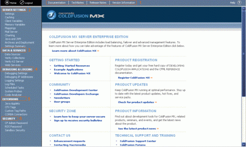 以上四個鏈接點擊后,會在管理界面的主體部分看到基于cfmx的不同的信息。Documentation主要是文檔,英文pdf,但是非常有用,從安裝到開發(fā),非常齊全,這里就不在贅述。只是要提醒大家一點,cfmx有一些tag和coldfusion5有了很大的區(qū)別,在使用的時候多多查閱手冊就可以了。以后的內容中,也會隨著tag的講解說到這些。TechNotes則是訪問Macromedia官方網站的知識庫,如果你的操作系統(tǒng)是中文的,那么會打開基于cfmx關于中文部分的一些Technotes,但是你不要抱太大的希望,目前打開的中文technotes頁面還是空的。Release Notes點擊后會看到Marcomedia目前發(fā)布了哪些關于coldfusionMX的資源和文檔,如果中文的操作系統(tǒng),請直接訪問http://www.macromedia.com/go/prod_releasenotes獲取相關信息。Version Information則是查看安裝在自己系統(tǒng)之上的ColdFusionMX的配置。標明安裝在機器上的版本是開發(fā)者版本還是專業(yè)版、企業(yè)版。