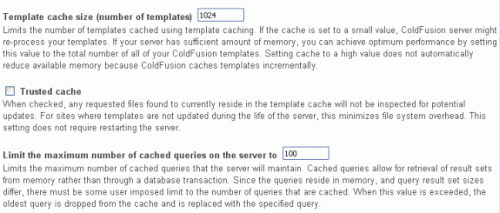 Template cache size (number of templates) n表示用于模版緩存的內存數量,默認是1024,建議在各位做WebSite時不要過分提高這里的數值,也不要設置為0,實際的數值參照站點的被訪問情況來定;Trusted cache選中后為不檢查cache中的頁面是否進行過更新,相比大家都不會勾選了吧,當然,如果你的website百十天也不更新一回,建議還是勾上這個選項,會加速web頁面的顯示;Limit the maximum number of cached queries on the server to n表示CFMX端存儲的查詢數量,默認是100個。這會加快同一查詢反復工作的速度。