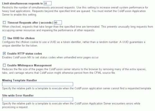 Limit simultaneous requests to n表示配置服務器接受同步請求的數量;Timeout Requests after(seconds) n表示服務器請求超時時間,標準單位為秒,也就是超過一定的時間(秒),服務器會自動中止該請求;Use UUID for cftoken在使用cftoken這個tag時使用UUID這種全局唯一標識方式處理事務,UUID=Universally Unique Identifier;Enable HTTP status codes允許當服務器未處理錯誤頁面時設置狀態(tài)編碼;Enable Whitespace Management允許CFMX服務器啟用空格管理,比如壓縮不必要的空格和縮進來壓縮CFML頁面的容量;Missing Template Handler提供了創(chuàng)建和傳遞通用的.cfm模版的方法,也就是在服務器發(fā)現請求索在頁面不存在時,給予的一個標準的顯示輸出;Site-wide Error Handler默認狀態(tài)下發(fā)生錯誤時,CFMX服務器會顯示一個包含錯誤信息的頁面,它與前一點的區(qū)別是頁面不存在和頁面出錯的兩種相對于瀏覽者的顯示模版可以分別定義。