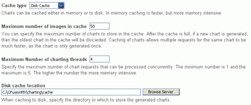 這里建議初學者使用默認設置,尤其是把Cache Type確定未Disk Cache而不是Memory Cache,如果你的站點用到cfchart的地方很多,有很多生成的圖表,那么強烈建議使用Disk Cache方式,而站點只有一兩幅圖表,那么使用Memory Cache會加快顯示速度。