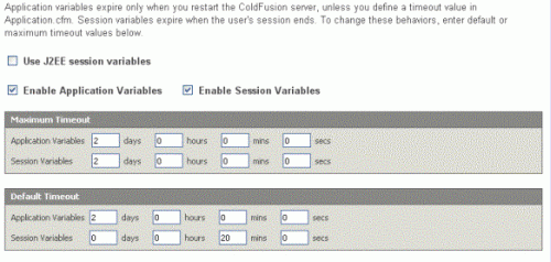 Memory Variables用于管理CFMX中的application和session的有效性,另外,它還可以使用J2EE的Session Variables。如下圖: