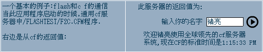 <cfset flash.result = "歡迎" & #Flash.sj# & "使用全球領(lǐng)先的cf服務(wù)器系統(tǒng),現(xiàn)在CF的標(biāo)準(zhǔn)時(shí)間是" & theTime>