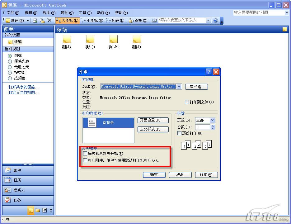 其實(shí)Outlook中提供了一個(gè)功能,可以讓你解決這個(gè)問(wèn)題。選擇所有你想打印的便箋,然后從菜單中選擇打印。在彈出的對(duì)話框中,在打印選項(xiàng)中去除復(fù)選框的勾選,點(diǎn)擊確認(rèn)。
