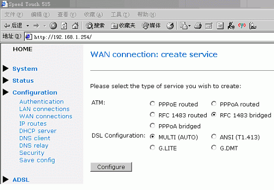 在選項(xiàng)中,ATM一項(xiàng)選中“RFC 1483 bridged”,DSL Configuration一項(xiàng)選中“Multi(AUTO)”。點(diǎn)擊“Configure”;