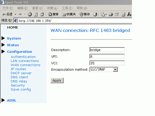 在相應(yīng)的框中分別填入連接名稱、VPI/VCI,并選擇封裝方式;點(diǎn)擊“Apply”;