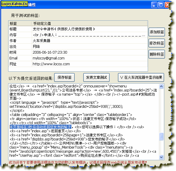 • 2.發(fā)貼方式使用HTML或UBB都可以,但是當(dāng)選擇使用HTML發(fā)貼時,你采集的目標(biāo)網(wǎng)站的內(nèi)容必需符合XHTML標(biāo)準(zhǔn)規(guī)范,否則發(fā)貼將不會成功,因為動網(wǎng)論壇程序會自動檢測你所發(fā)布的內(nèi)容是否符合XHTML標(biāo)準(zhǔn)規(guī)范.基本的XHTML標(biāo)準(zhǔn)規(guī)范請見:http://locoy.kalvin.cn/read.php/10.htm