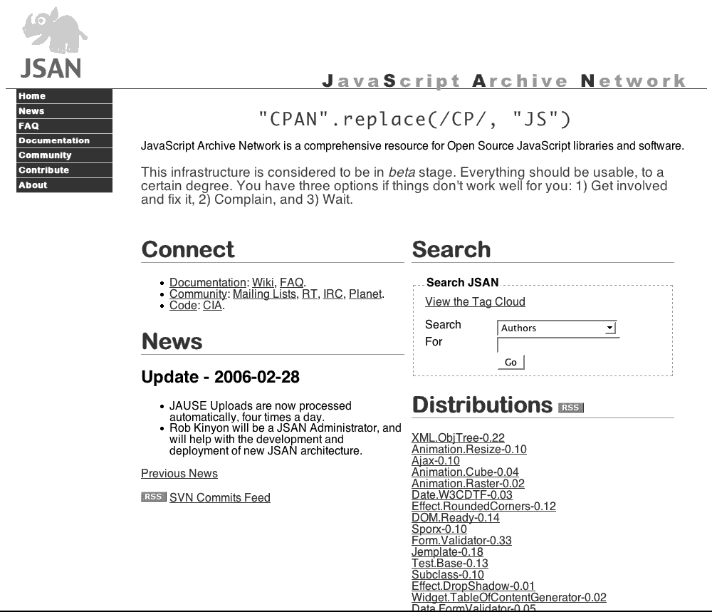 然而,這種命名空間方法存在一個(gè)問題,即庫與庫之間在構(gòu)造和使用的方式上缺乏內(nèi)在的一致性。正是在這一點(diǎn)上,中心代碼倉庫如JSAN(JavaScript Archive Network)變得非常有用。JSAN提供一套代碼庫需遵從的一致規(guī)則,以及一種快捷導(dǎo)入代碼所依賴的其它庫的方式。圖1-2展示了JSAN的主分發(fā)中心的一個(gè)截屏。