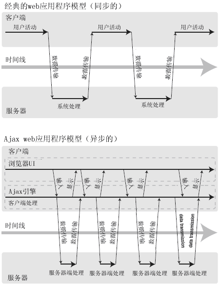 圖1-3:來(lái)自文章"Ajax:Web應(yīng)用程序的新途徑"的圖示,展示發(fā)生于客戶和服務(wù)器之間的先進(jìn)的異步的交互