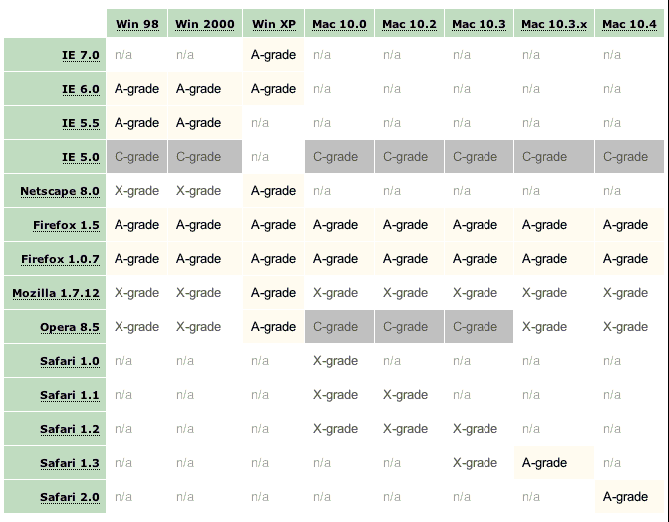 Yahoo開(kāi)發(fā)了一個(gè)分級(jí)的瀏覽器支持策略,對(duì)瀏覽器指定特定的級(jí)別并依據(jù)其功能為它提供不同的內(nèi)容。Yahoo給瀏覽器三個(gè)級(jí)別:A,X和C:
