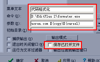 “ucren.com $(copy)$(cursel)”,注意去掉“保存已打開文件”前面的勾,配置完后點(diǎn)確定或應(yīng)用。到此,所有的配置工作就已經(jīng)完成了,默認(rèn)的快捷鍵是 ctrl+數(shù)字鍵,你也可以自定義快捷鍵,比如,我就把這個(gè)功能定義為 ctrl+alt+F