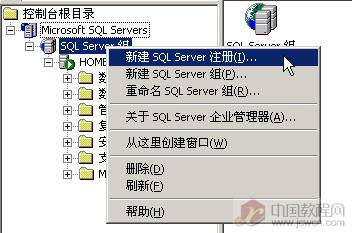 點擊“開始”-“程序”,在“Microsoft SQL Server”菜單中打開“企業(yè)管理器”。在企業(yè)管理器中,右鍵單擊“SQL Server組”,選擇“新建SQL Server注冊”。
