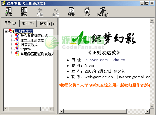 織夢幻影《正則表達式》專集教程,講述什么是正則表達式、如何建立正則表達式、括號表達式、字位符、如何核匹配正則表達式等。對于想學習的新手來說,這個小巧的CHM教程還是很適合你的。