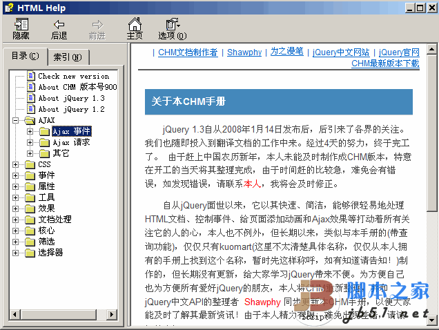 jQuery 1.3自從2008年1月14日發(fā)布后,后引來了各界的關(guān)注。我們也隨即投入到翻譯文檔的工作中來。經(jīng)過4天的努力,終于完工了。 由于趕上中國農(nóng)歷新年,本人未能及時(shí)制作成CHM版本,特意在開工的當(dāng)天將其整理完成,由于時(shí)間趕的比較急,難免會(huì)有錯(cuò)誤,如發(fā)現(xiàn)錯(cuò)誤,請(qǐng)聯(lián)系本人,我將會(huì)及時(shí)修正。