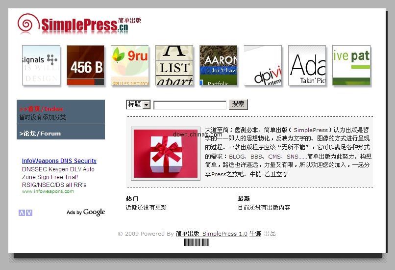 大道至簡;蠡測必非。簡單出版(SimplePress)1.0采用Asp+Acc編寫,Css+Xhtml設計,可以應用于個人、企業(yè)、網(wǎng)絡等不同站點的搭建。