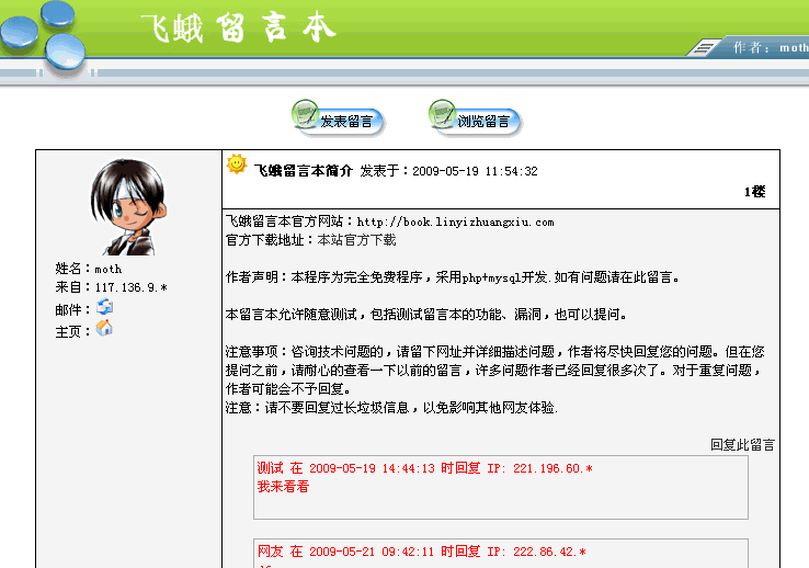 ☉ 本站提供的飛蛾 php+mysql 留言本資源來(lái)源互聯(lián)網(wǎng),版權(quán)歸該下載資源的合法擁有者所有。