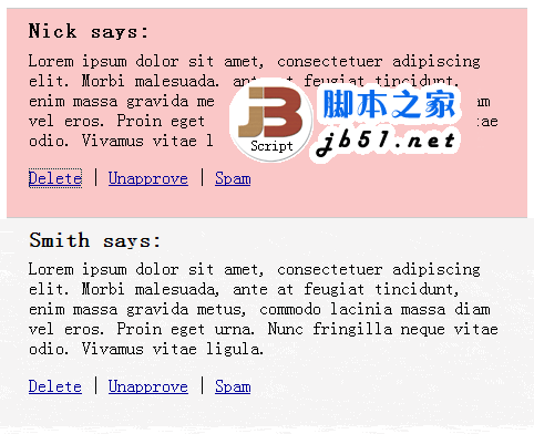 jQuery實現(xiàn)的仿WordPress刪除評論的特效功能,這里的刪除實則是隱藏,要完成真正的刪除需要配合ASP、PHP或其它服務器端語言,本實例幫你理解jQuery對層的控制能力和方法。