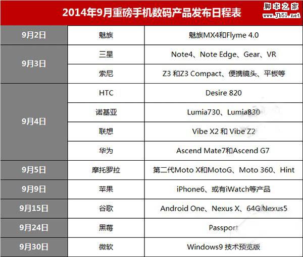 首先腳本之家為大家整理了9月份各大品牌新產(chǎn)品發(fā)布會(huì)的日程表(該表格將隨時(shí)根據(jù)最新消息進(jìn)行更新):