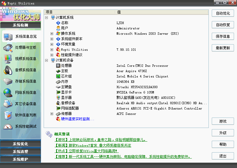 從系統(tǒng)信息檢測(cè)到調(diào)校、從系統(tǒng)清理到維護(hù),Windows優(yōu)化大師都為您提供比較全面的解決方案。Windows優(yōu)化大師同時(shí)適用于Windows98/Me/XP/2000/2003/Vista操作系統(tǒng),提供了全面有效、簡(jiǎn)便安全的:系統(tǒng)檢測(cè);系統(tǒng)清理;系統(tǒng)維護(hù);系統(tǒng)優(yōu)化等功能,讓您的電腦始終保持在最佳狀態(tài)。